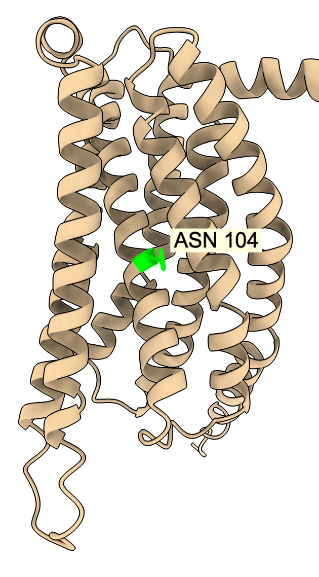 Clicking on any point in the plot brings up a menu identifying the mutation and allowing coloring, selecting (green outline), or zooming on the residue in the atomic structure. For example mutation N104V has very high activity at pH 6.5 (score 8), but modest activity at pH 5.5 (score 1).