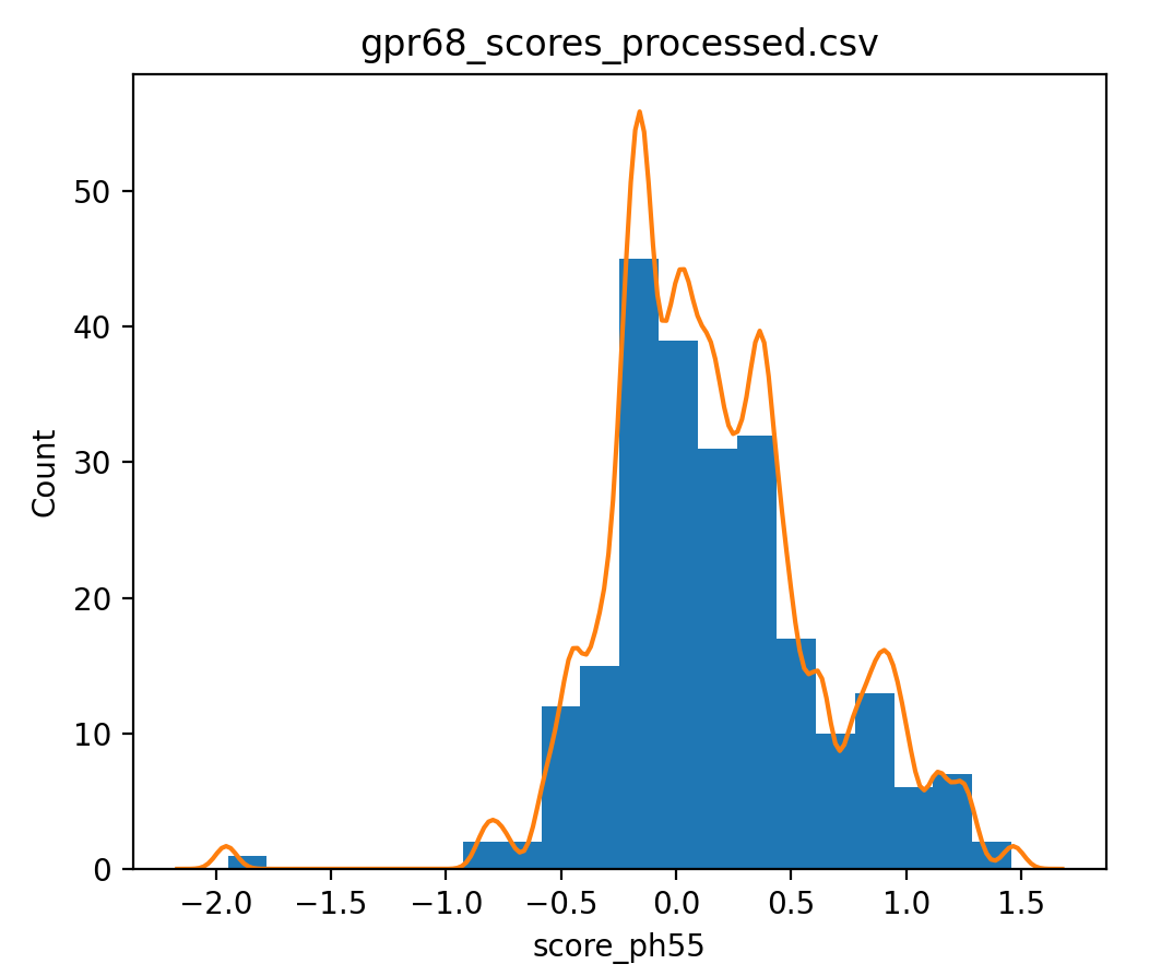 In the GPR68 cell assays reduced expression on the membrane of the protein reduces the pH 5.5 and 6.5 scores. We could try to correct for this by making a least squares linear fit of score_ph55 versus score_surface and assuming that line estimates the change in activity due to surface expression level we can subtract that estimate from the pH 5.5. Here is how to show a histogram with that subtraction for the synonymous mutations.