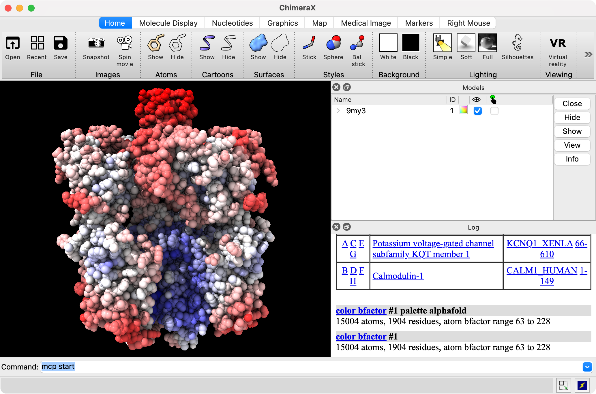 ChimeraX controlled by Claude coloring by bfactor. |