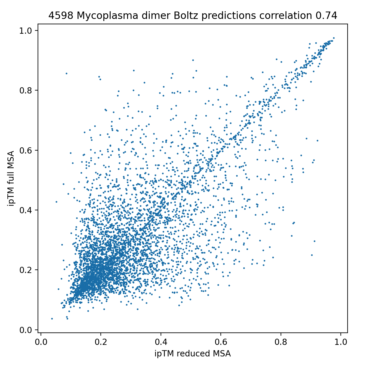 Correlation of ipTM interface quality scores for 2 Boltz runs with reduced or full length MSAs. |