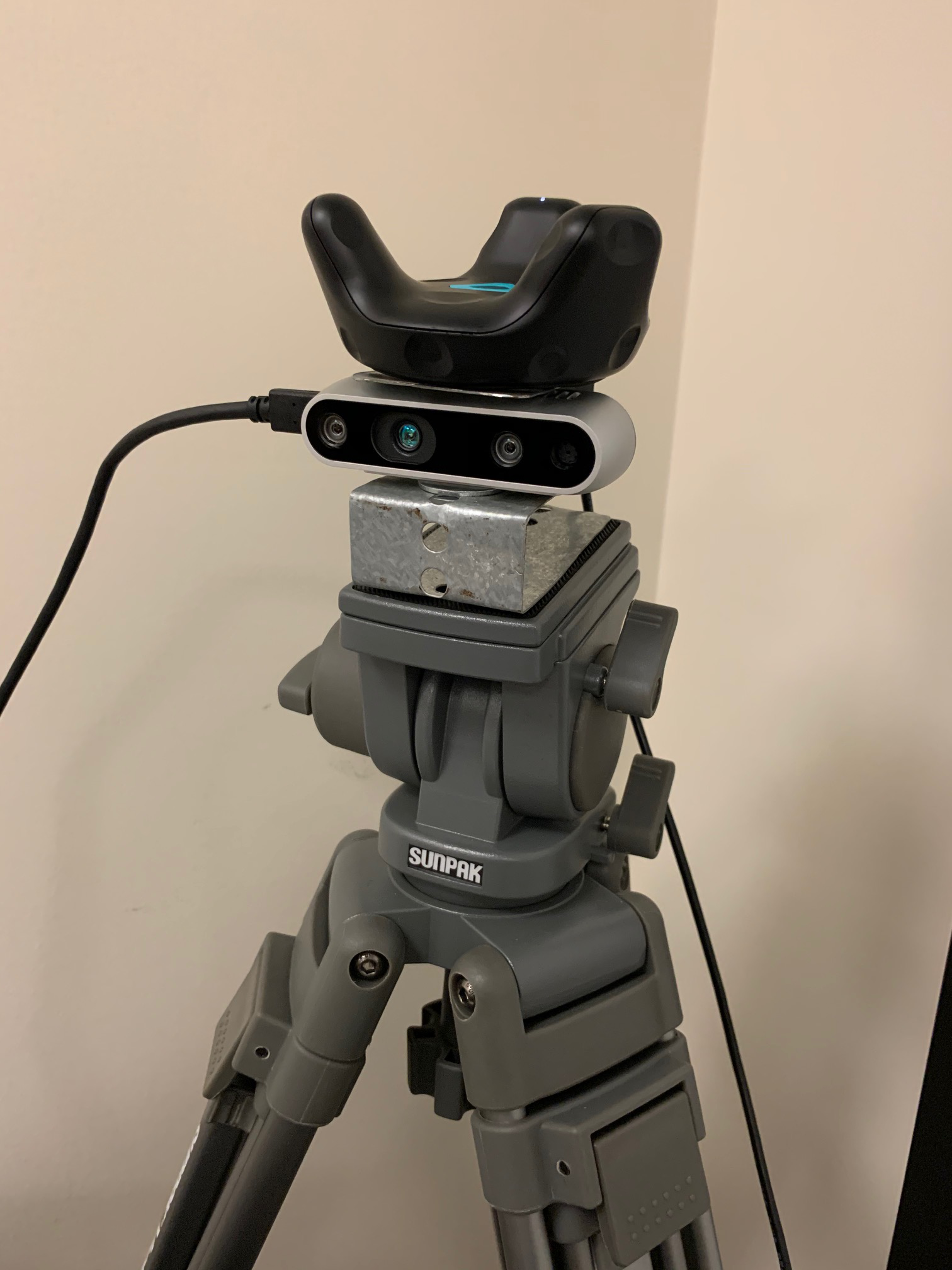 - Optional: Vive tracker ($99) to avoid realigning camera every time it is moved. I believe this requires either a Vive, Vive Pro, or Valve Index headset to use the Vive tracker. Also you'll need to make a bracket to attach the tracker to the depth camera as shown in the image at right.