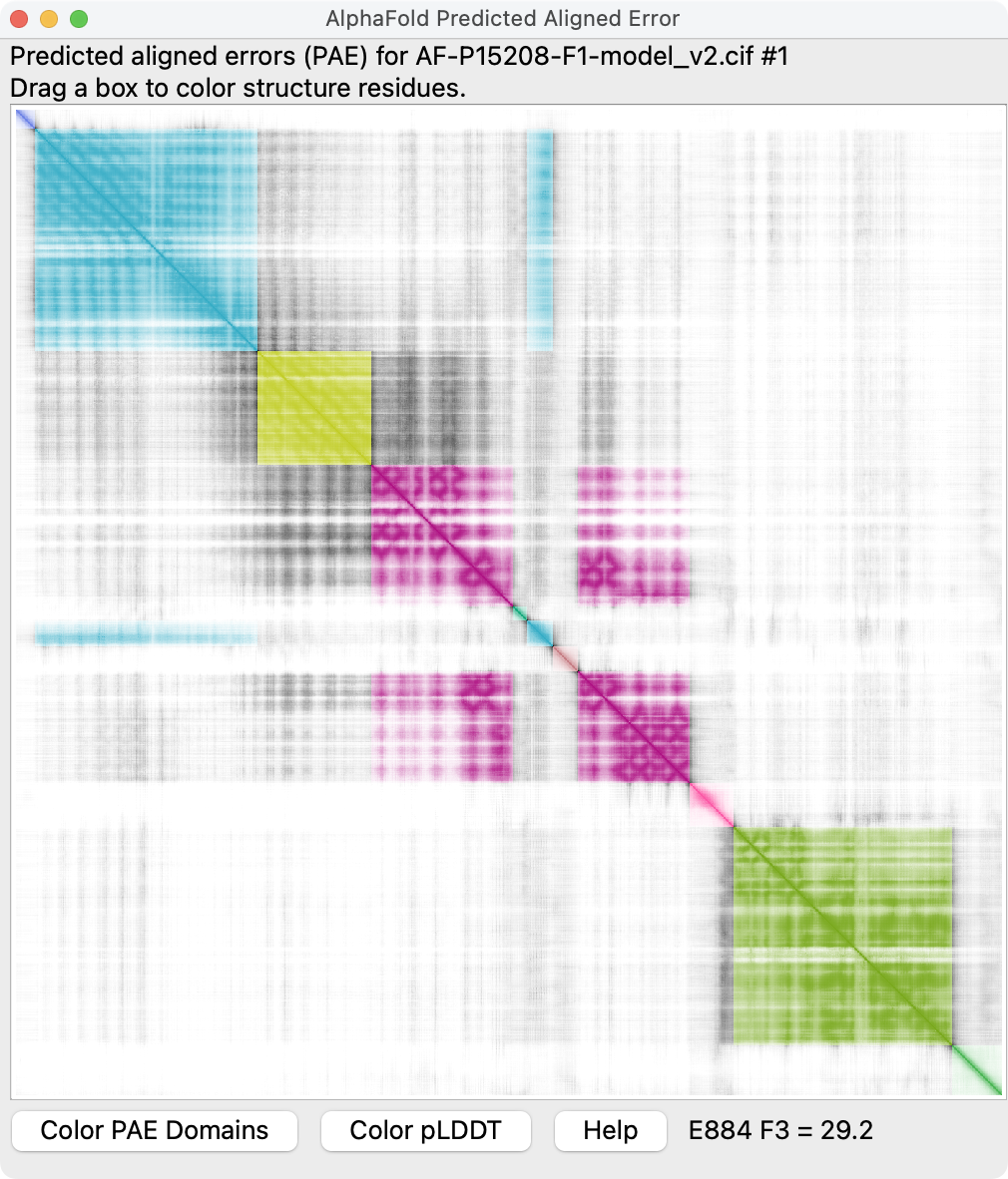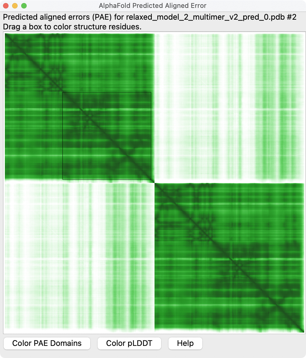 Here is an example where the PAE plot and default PAE domain coloring suggests some domain packing is correct when it is actually wrong. Adjusting the PAE domain clustering threshold can highlight the wrong domain packing.