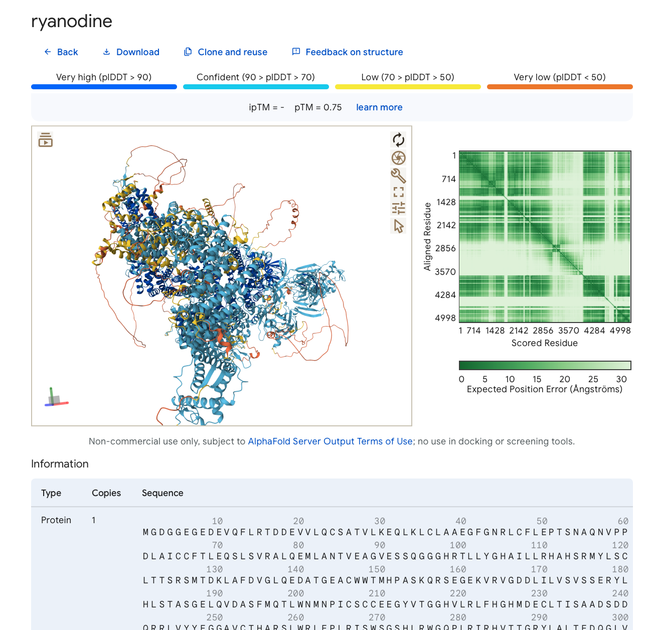 Ryanodine receptor monomer 5000 residue prediction shown by AlphaFold 3 server.