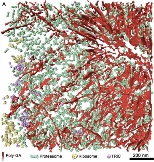 Poly-Gly-Ala aggregates (red) surrounded by proteasomes (green) within a neuron described in the followng article:
