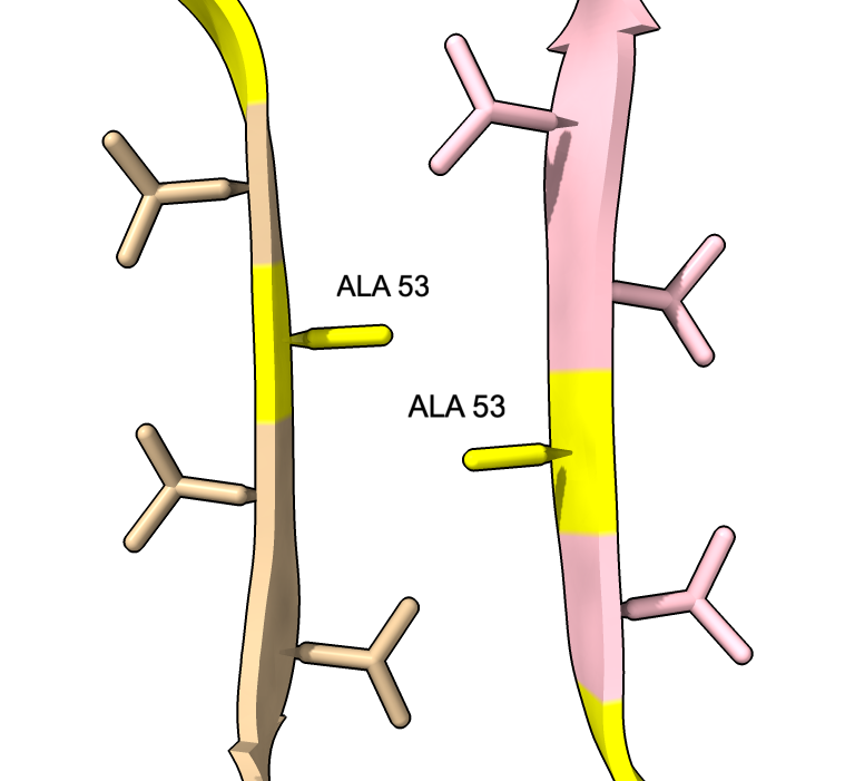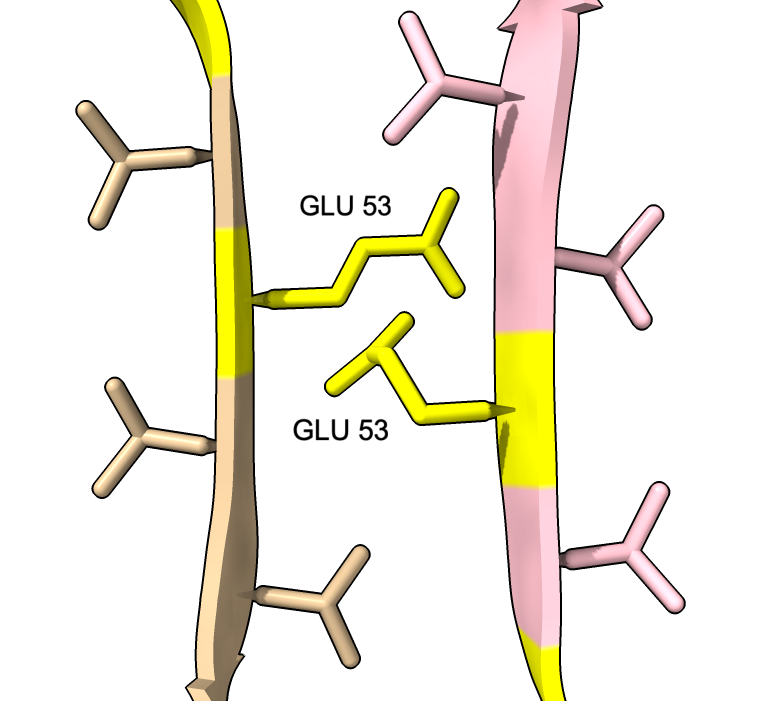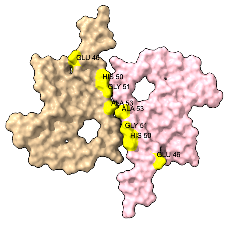 | color :46,50,51,53 yellow label :46,50,51,53 height 3 | Alanine 53 at proto-filament interface. | swapaa /I,G:53 GLU
