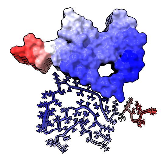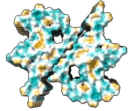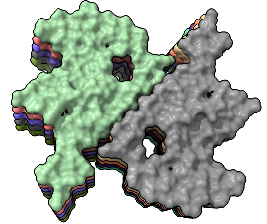 | hide /A,B,C,G,H surface hide /A,B,C ribbon Dimer interface is not very hydrophobic. | color bfactor show /G,H atoms Blue is highest resolution, red lowest. |