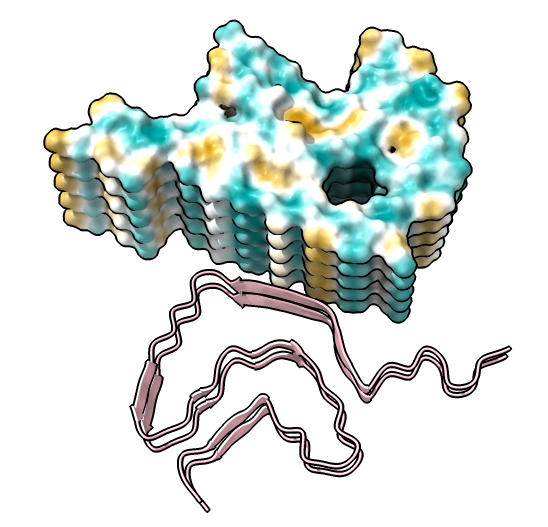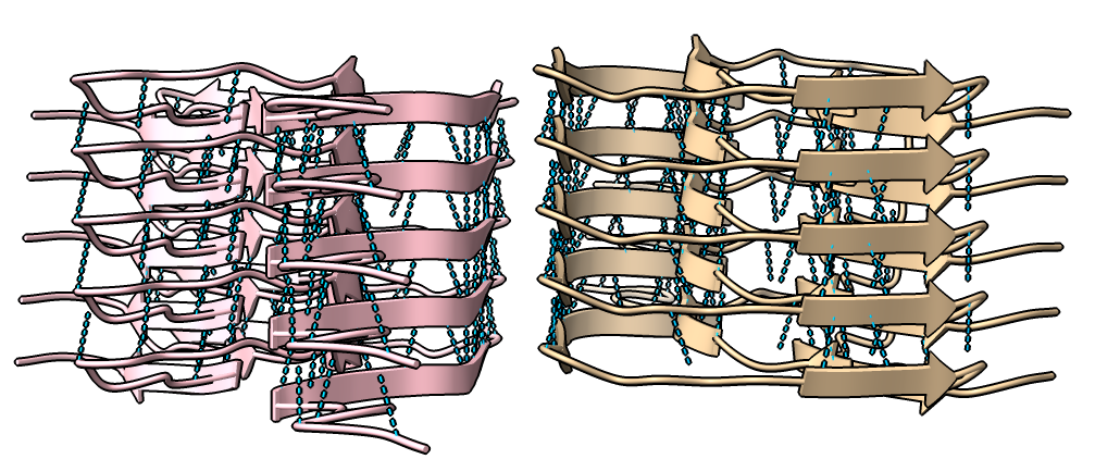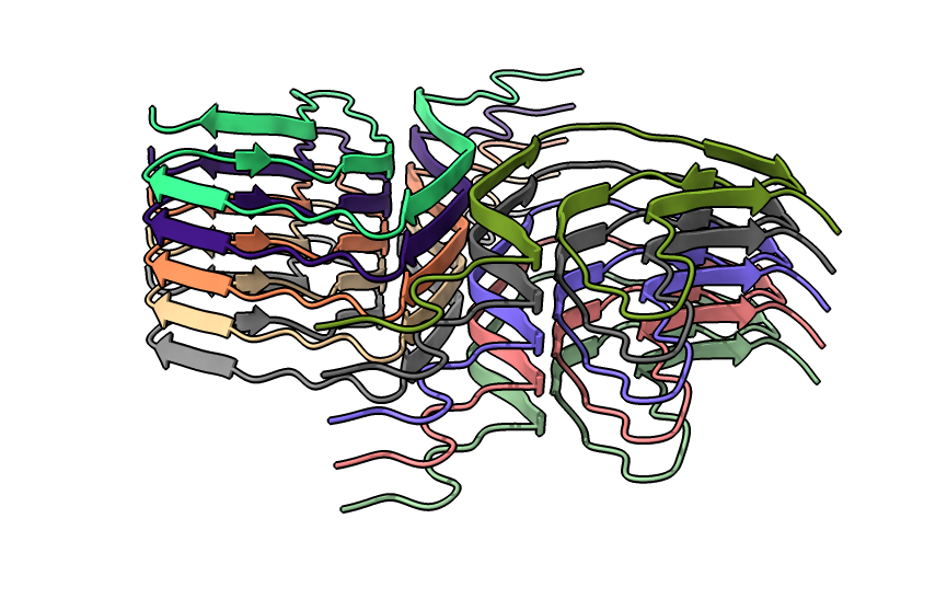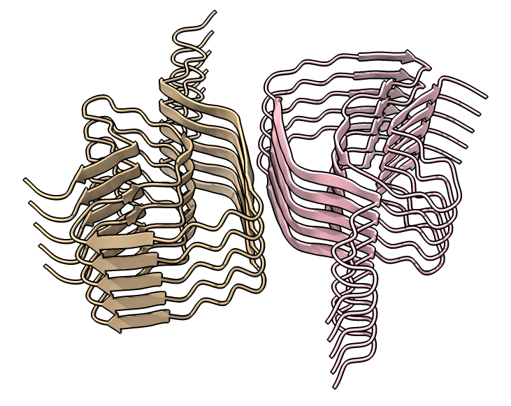 | open 6h6b | hide atoms show ribbons | Looking down fibril axis. |