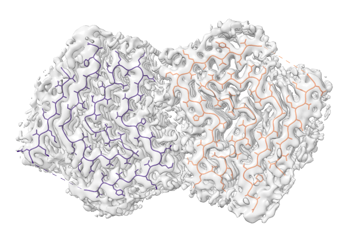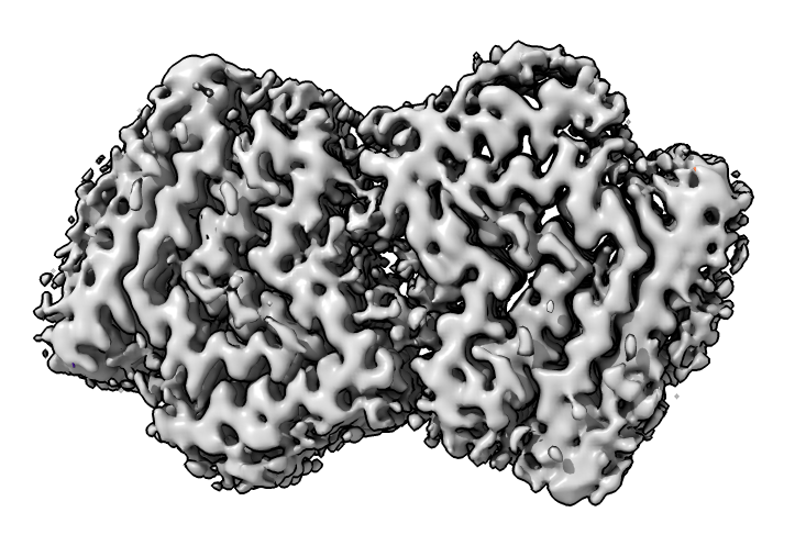 Look at cryoEM map EMDB 4994 used to determine atomic model PDB 6rt0.