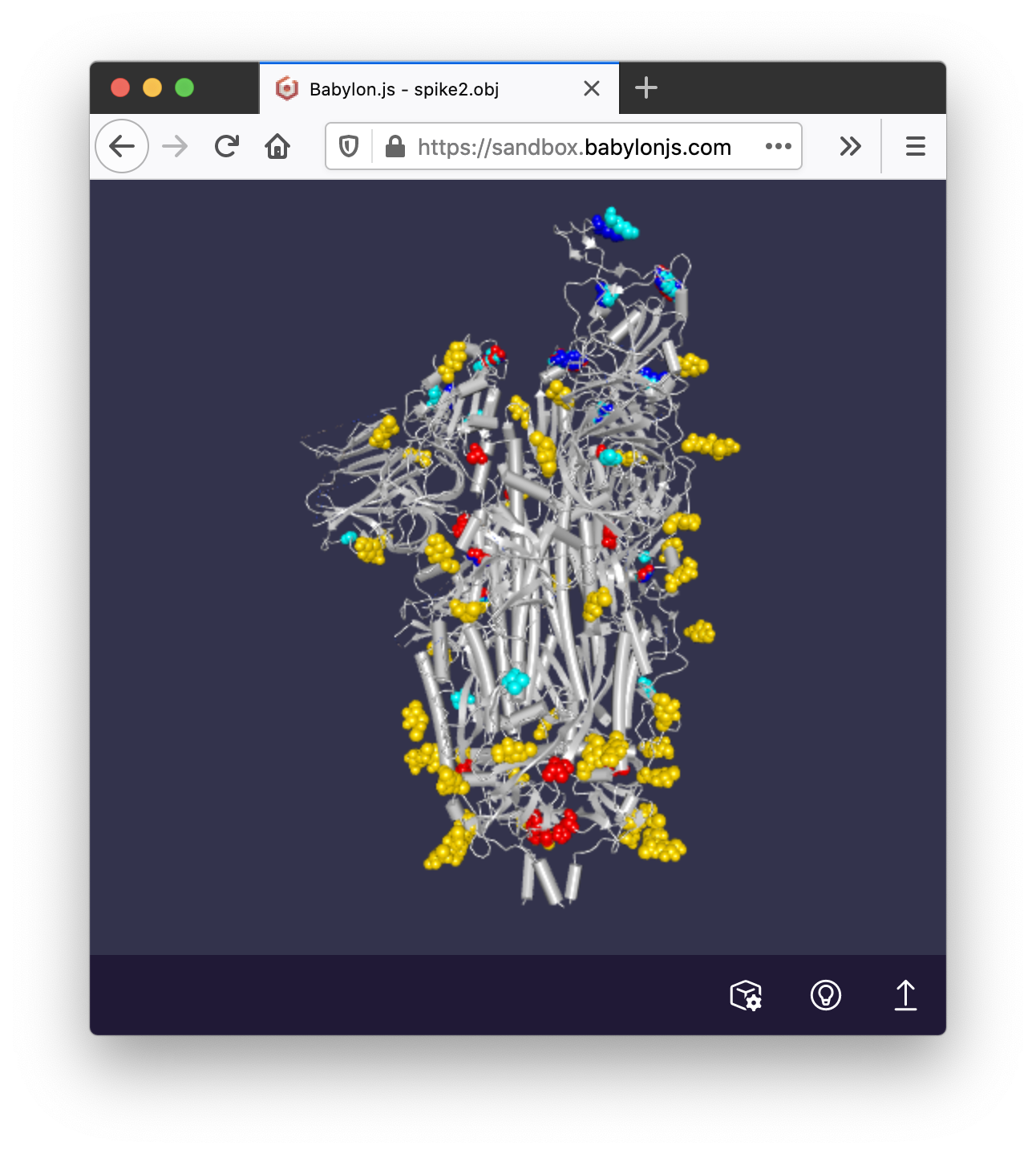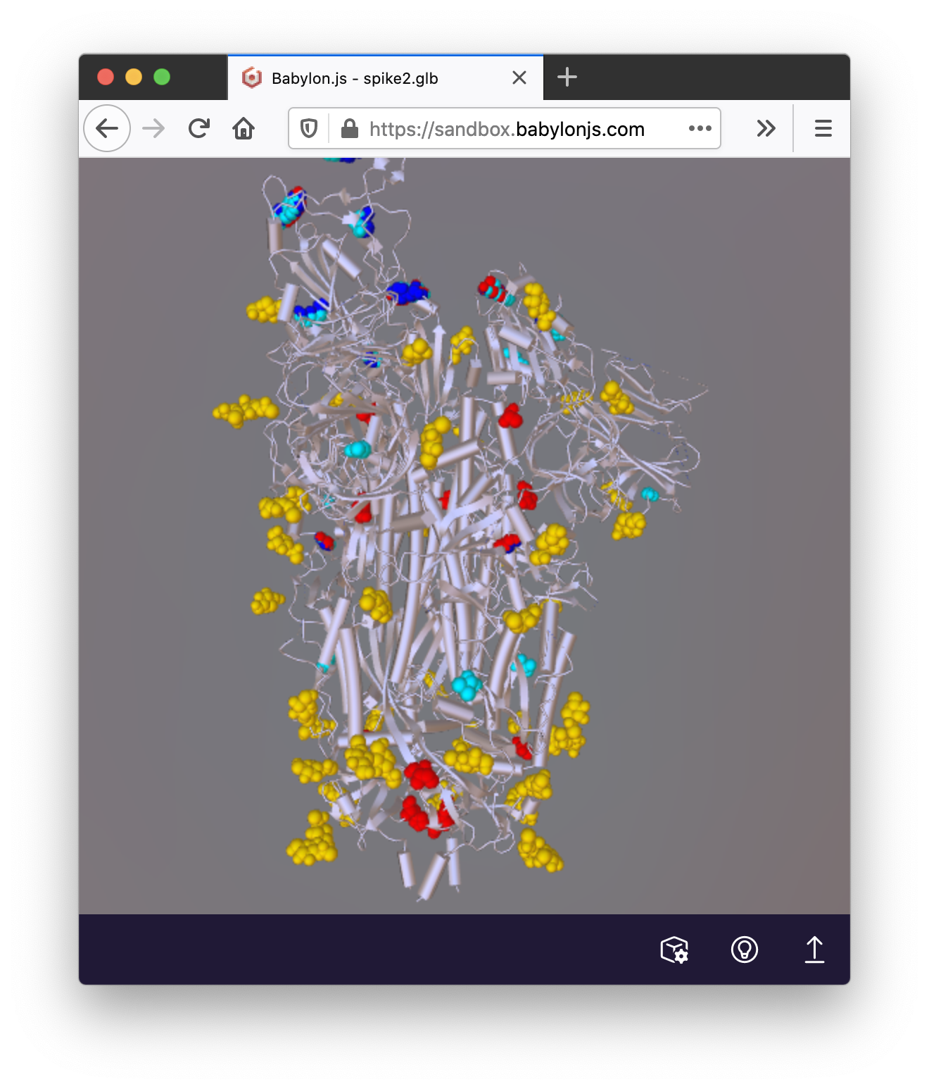 ChimeraX colors the model using vertex colors. Each of the 3 vertices of a triangle have a color and the color varies smoothly across each triangle. Babylon.js can read vertex colors. But it is hard or impossible to use vertex colors in some 3D modelling packages (Blender, Maya, Cinema4D), that instead use texture colors. The GLTF file saved above will contain vertex colors because that is what ChimeraX uses internally. To write texture colors (spike3.glb) use an additional option available in ChimeraX versions newer than June 24, 2021.