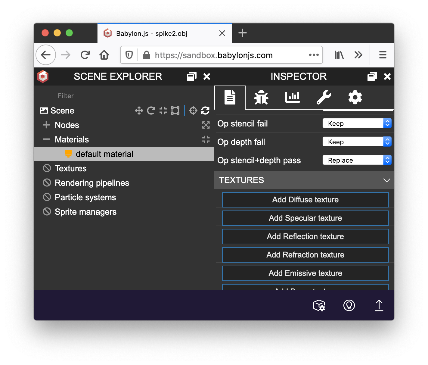 We can test the 3D model in the Firefox web browser using Babylon.js sandbox. Drag the spike2.glb file onto the browser window.