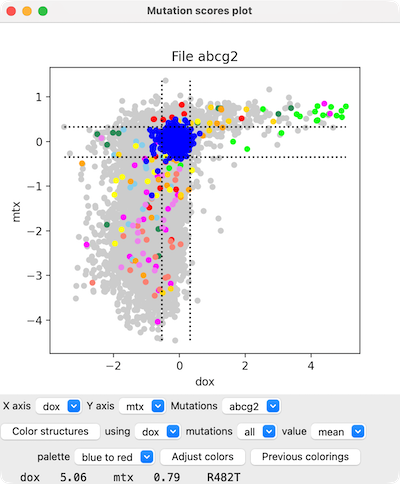 Opening a mutation scores file automatically shows a scatter plot of the mutants with the first two scores as the axes, or a histogram if the file only contains one kind of score. The menus below the plot can be used to change which scores are plotted and for which mutation set.