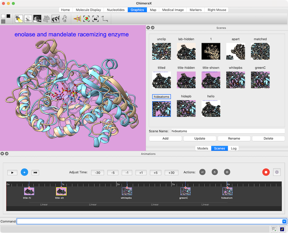 Animations is a timeline-based graphical interface for creating movies from a series of scenes and other actions. The scene mode of the GUI is documented in this page. See also: making images, making movies