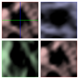 - clicking shows orthogonal red (cryo-EM-beam-aligned XY), green (XZ),