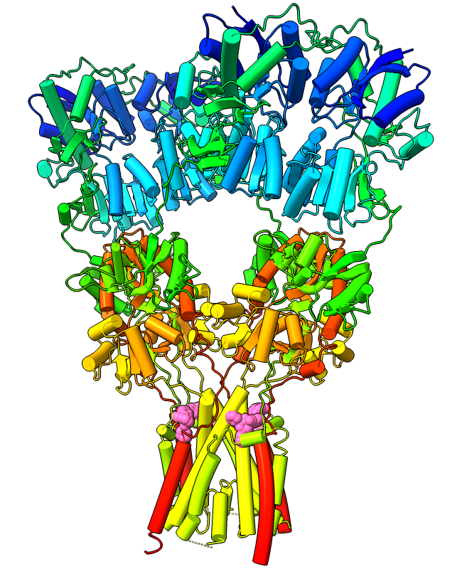 Protein α-helices can be shown as curved-cylinder “tubes“ with the cartoon style command. Helix tube mode is an alternative to the standard spiraling ribbons, and both modes are fully integrated with coil and β-strand cartoons. The structure at left is an AMPA-subtype glutamate receptor bound to the antiepileptic drug perampanel (PDB 5l1f). The receptor is tetrameric, and each chain is rainbow color-coded from blue at the N-terminus to red at the C-terminus. Four molecules of perampanel (pink) are bound near the bottom, between the transmembrane domain and the rest of the receptor. For image setup other than orientation, see the command file ampar.cxc.