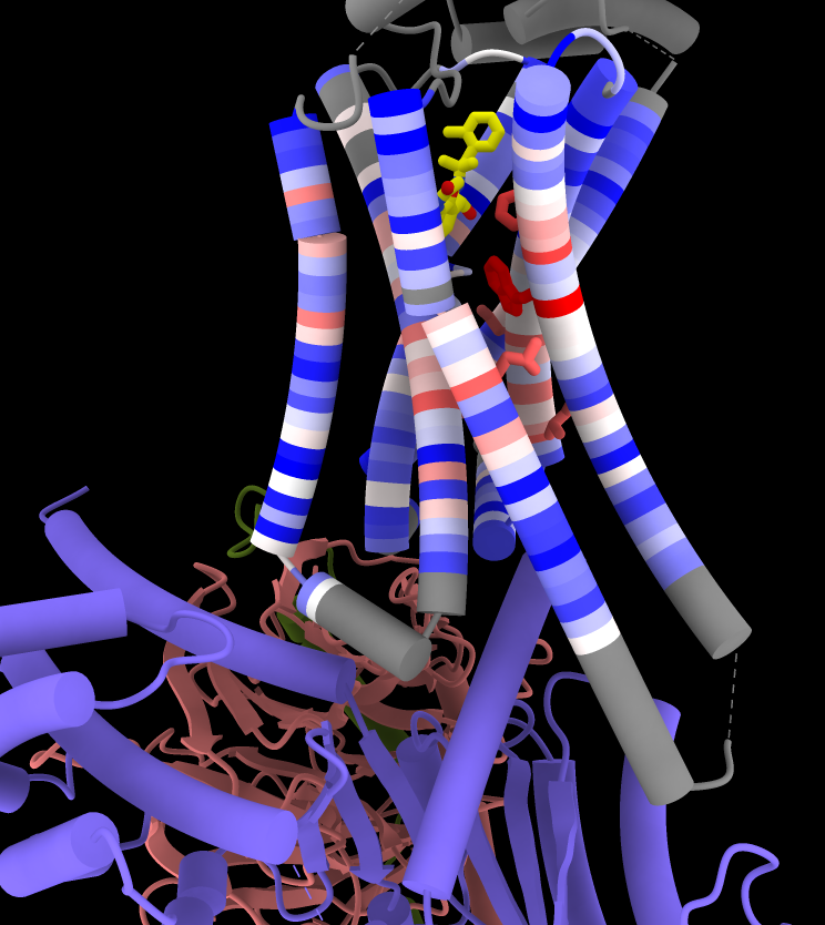Atomic structures, including cartoons and molecular surfaces, can be colored by the conservation in an associated multiple sequence alignment. The figure shows a structure of the β2-adrenergic receptor signaling complex (PDB 3sn6) with receptor cartoon colored blue→white→red from least conserved to most conserved. The β2-adrenergic receptor is a member of the class A G-protein-coupled receptor superfamily. Conservation was calculated from a superfamily alignment from PASS2 using the entropy-based measure from AL2CO (included with ChimeraX courtesy of Pei and Grishin). The sequence alignment and step-by-step instructions for making this image are given in the Coloring by Sequence Conservation tutorial.