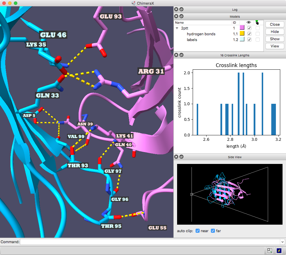 The histogram of H-bond distances on the top right is interactive: when the cursor is placed over a bar in the histogram, the corresponding H-bonds are temporarily enlarged in the 3D view and the others hidden. For image setup other than orientation, see the command file hb3.cxc.