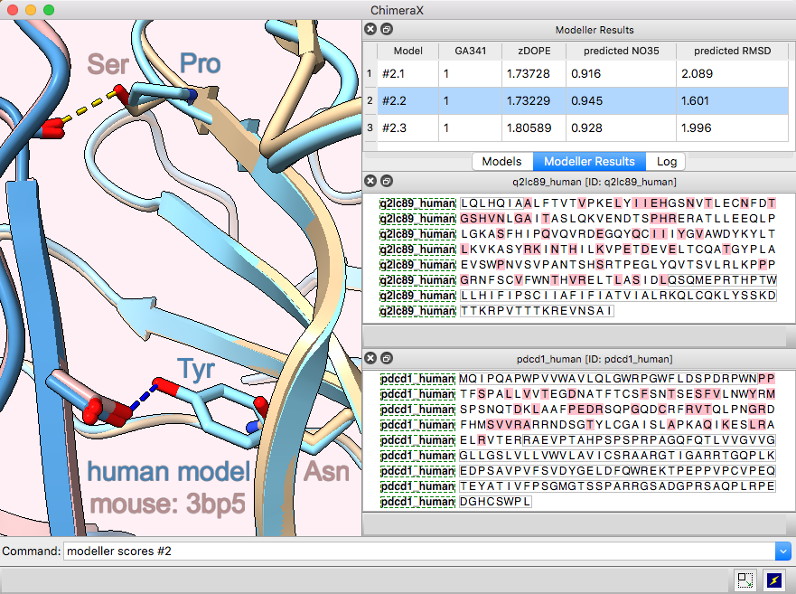 Comparative modeling requires a template structure and a target-template sequence alignment for each unique chain. The sequences of human PD-1 and PD-L2 targets were fetched from UniProt and associated with the corresponding chains in the template structure, see model-pdl-setup.cxc. (Pairwise or multiple sequence alignments could have been used, but in this case, the template structure was simply associated with the target sequence.) Sequence-structure association shows mismatches in the Sequence Viewer: pink boxes for sequence differences between mouse and human, and gray outlines around the parts missing from the structure.