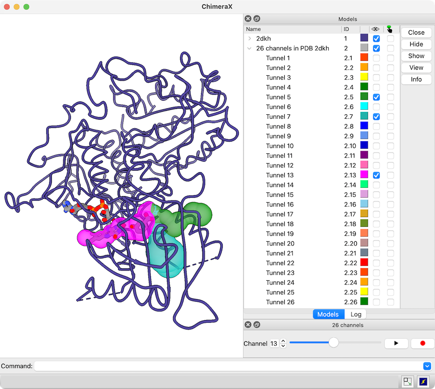 A JSON file downloaded from the MOLEonline Server can be opened in ChimeraX version 1.5 and newer. A sphere model is generated for each channel in the file, and if the file contains more than one channel, a slider interface will appear for flipping through them one by one. Since the channels are individual models in ChimeraX, it is also easy to view more than one at the same time, change their colors, etc. using the Model Panel and/or commands. For image setup, see the command file 2dkh-mole.cxc and data file 2dkh-channels.json. See also the MOLE Channel Coloring by Property tutorial.