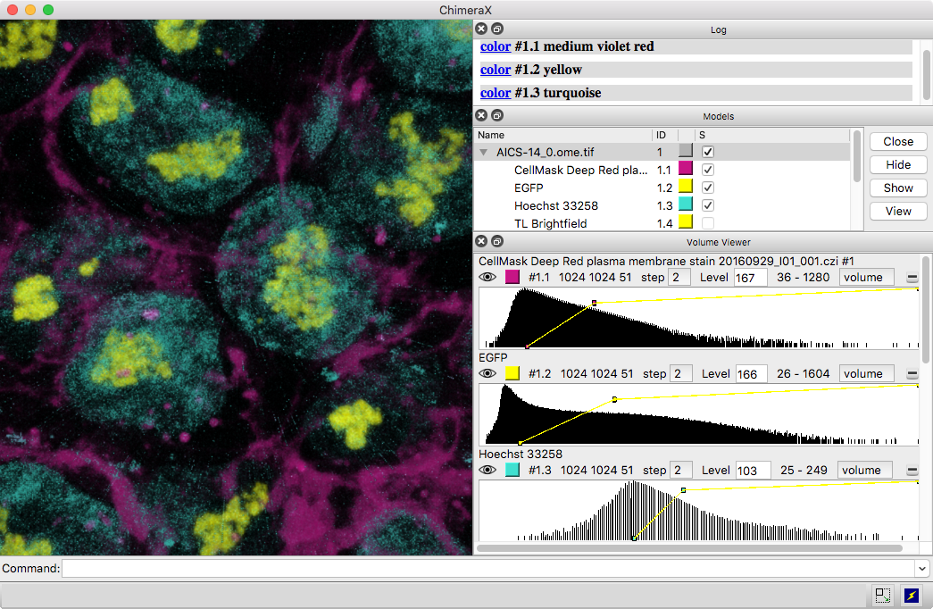 3D images and time series from multichannel optical microscopy are shown in the Volume Viewer tool, with easy access to hiding/showing individual channels, changing their colors, and adjusting threshold levels with the mouse. The menu of style options includes “volume” (translucent blobs, as in the image), surface, mesh, maximum intensity projection, single plane, and orthoplanes. For convenience, the step size, region bounds, and display style of different channels of the same dataset are coupled, in that changing the setting of one channel automatically changes it for the others.