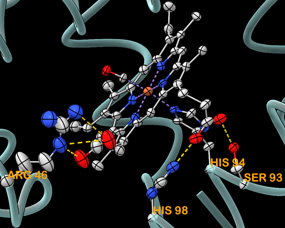 Anisotropic B-factor data can be shown as thermal ellipsoids, axes, or ellipses with the aniso command or the Thermal Ellipsoids tool. The image shows myoglobin structure 1jw8 with thermal ellipsoid representations of the heme residue and protein sidechains that ligate or form H-bonds with the heme. Metal coordination bonds are shown as purple dashed lines and H-bonds as gold dashed lines.