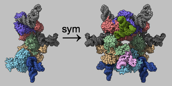 Multimeric assemblies defined in a structure's mmCIF file are automatically listed when the file is opened and can be reconstituted with the sym command. The complex of selenocysteine synthase and tRNASec (PDB 3w1k) is shown as molecular surfaces of different colors for different chains. The asymmetric unit is on the left and the assembly specified in the mmCIF file is on the right, with arrow and text annotations from 2dlabels. See the command file sym.cxc.