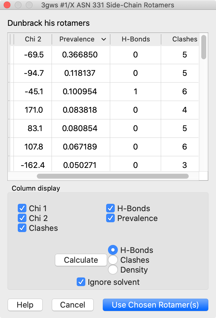 Rotamers is an interface for showing amino acid sidechain rotamers and optionally replacing the original sidechain, also implemented as the swapaa command. The rotamers can be shown all at once, as in the figure, or individually by choosing rows in the dialog.