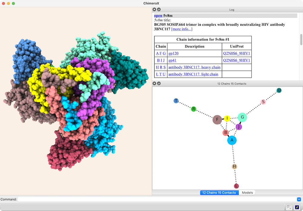 The structure is an HIV envelope glycoprotein trimer bound by three copies of a broadly neutralizing antibody (PDB 5v8m), with chain information shown in the Log. Glycosylations (not displayed) were included in the surface area calculations. For setup, see the command file trimer-network.cxc.