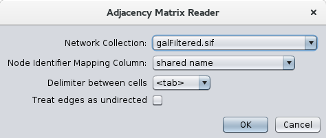 Once the App is installed from the app store, using it is a simple matter of doing a File→Import→Network→File and choosing a file with a ".mat" extension. Once the file has been chosen, the dialog shown in Figure 1 will be displayed. The top part of the dialog (Network Collection and Node Identifier Mapping Column) are standard for importing files when there is already a network connection. These two items will not show if there are currently no network collections. The next two items allow you to choose the delimiter for your adjacency matrix (currently supported are tab, comma, vertical bar, and space) and whether or not to treat the edges as undirected. If you choose undirected edges, only one edge will be imported for each pair of nodes. In some cases, it might be better to leave this unchecked and collapse duplicate edges later.