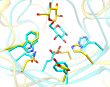 β-1,4-glycanase (gold, Protein Data Bank entry 1exp) and cellobiohydrolase I (cyan, Protein Data Bank entry 1cel) have different folds but a similar pattern of amino acids near a glucose residue. This possible example of convergent evolution was identifed in Table 5 of:
