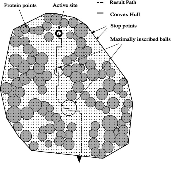 - method uses points on a grid, finds tunnels that minimize an expense function based on proximity to atoms