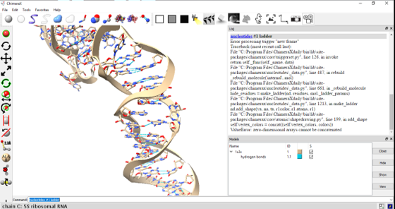 Hi everybody, I’m not able to represent the side chains of an RNA molecule as a ladder with the command ’nucleotides’. I’ve tried it in ChimeraX 0.6 and ChimeraX 0.7 daily and it is simply not represented. In the image below I’m testing the command on a 5S ribosomal RNA and I got the error of an empty Array. Sometimes I don’t get any error, the command seems to be recognized (in the log) but nothing changes on the molecule itself. I also tried to show all atoms, hide atoms, hide ribbon, delete hbonds, look for hbonds again, specify the model (#1) only, specificy the hydrogen bonds (#1.1) but nothing seems to work. Am I doing something wrong? Thank you for your consideration. André Rosa [cid:image002.png@01D3ED19.13D3A880]