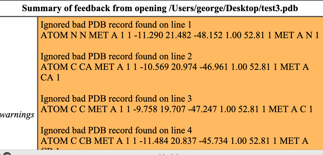 Hi, I have problems opening the attached file. I get the following warning messages (see screenshot) but unfortunately I cannot immediately see what’s wrong and therefore unable to find a fix. The first 5 lines of my pdb file are: 1 ATOM N N MET A 1 1 -11.290 21.482 -48.152 1.00 52.81 1 MET A N 1 2 ATOM C CA MET A 1 1 -10.569 20.974 -46.961 1.00 52.81 1 MET A CA 1 3 ATOM C C MET A 1 1 -9.758 19.707 -47.247 1.00 52.81 1 MET A C 1 4 ATOM C CB MET A 1 1 -11.484 20.837 -45.734 1.00 52.81 1 MET A CB 1 5 ATOM O O MET A 1 1 -8.587 19.687 -46.902 1.00 52.81 1 MET A O 1 I’d be grateful for your help George