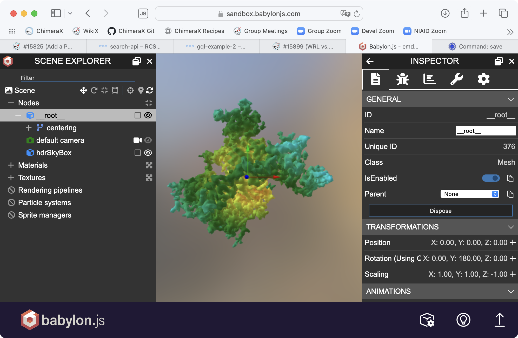 I don't know if this is possible for ChimeraX to accomplish, but this is how I would expect the glTF to be constructed such that the file will rotate/translate/scale around an axis centered on the geometry that is in world space at 0,0,0. You may also be able to do what Babylon does and drop in a parent node at 0,0,0 (this also works in Blender). The reason I don't love this solution is that it has the same issue as Babylon Sandbox. It isn't "fixing" the root problem, the geometry is still not centered on its local origin. It's just buried in a node structure that will need to be maintained for the file to be usuable.