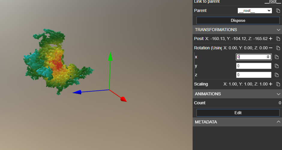 If I understand the situation correctly I can see if I can do the transformation propagation from vertex buffers up the tree to make a more usable GLTF file. One casualty of that is that you lose the original crystallographic coordinates for say an x-ray atomic model node. The node no longer has those coordinates and you only know where it is in the overall scene. But for use of these GLTF files where knowing the original source data coordinates is not likely to be important, that is no loss.