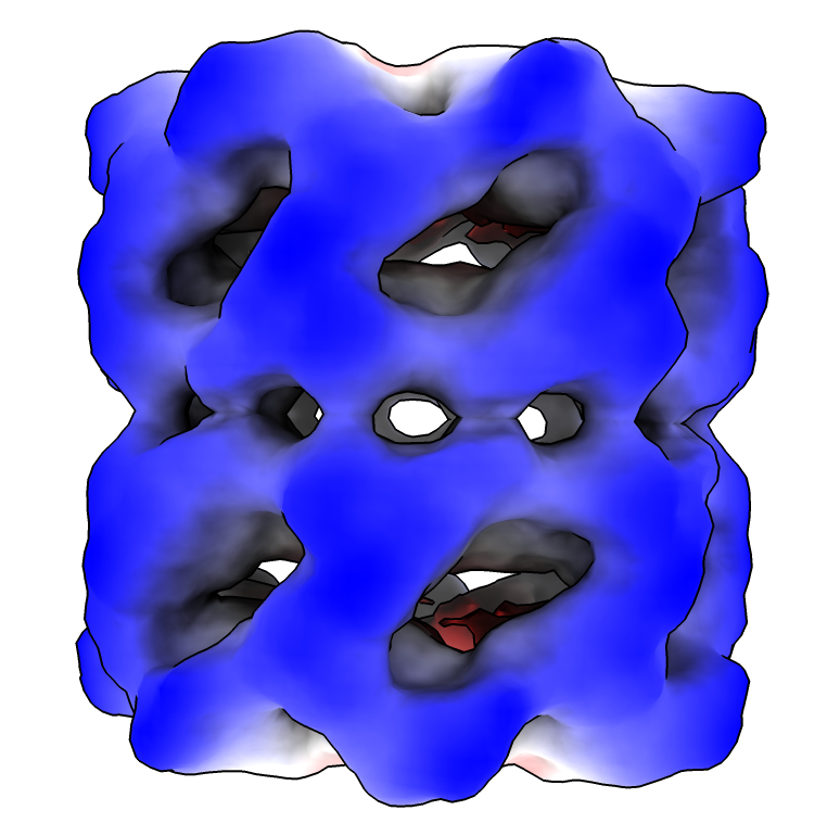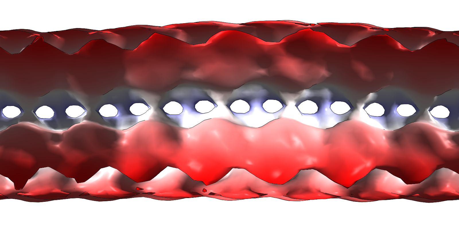 Hi Pranav, I guess you mean you want to save a 360 degree projection image of your colored map? There is nothing quite like that in ChimeraX. If you want a 360 view from the center of the map you can get that with "camera 360" after positioning the view point in the middle of the map. For example open 1080 from emdb color cylindrical #1 palette redblue move z 350 turn x 90 center #1 camera 360 There is also command volume unroll that can unroll a cylindrical map. But it does not preserve coloring. And there was a flatten icosahedron capability that worked with atomic models in Chimera that is not in ChimeraX. https://www.cgl.ucsf.edu/chimera/experimental/flatten_icosahedron/flaticos.html For what you want you could spin the model around 360 degrees recording images each 0.2 degree, then have a script take the center column of pixels from each image and lay those columns side-by-side in a single image 1800 pixels wide. Tom Example of camera 360 giving view inside map EMDB 1080.  > On Oct 22, 2024, at 10:51 AM, Pranav Shah via ChimeraX-users <chimerax-users@cgl.ucsf.edu> wrote: > > hi Team, > This is potentially a left-of-center question, but is there a way I > could generate a mercator projection of an MRC volume that I have > colored by zone? I am happy to code this up in the chimerax python > environment, but I am not sure how I could access the voxel colour > information before projecting the volume. > > Best, > Pranav > -- > Pranav Shah > Postdoctoral Research Fellow. > > Division of Structural Biology, > Wellcome Trust Centre for Human Genetics, > University of Oxford, > Roosevelt Drive, Oxford OX3 7BN, > UK > _______________________________________________ > ChimeraX-users mailing list -- chimerax-users@cgl.ucsf.edu > To unsubscribe send an email to chimerax-users-leave@cgl.ucsf.edu > Archives: https://mail.cgl.ucsf.edu/mailman/archives/list/chimerax-users@cgl.ucsf.edu/ >