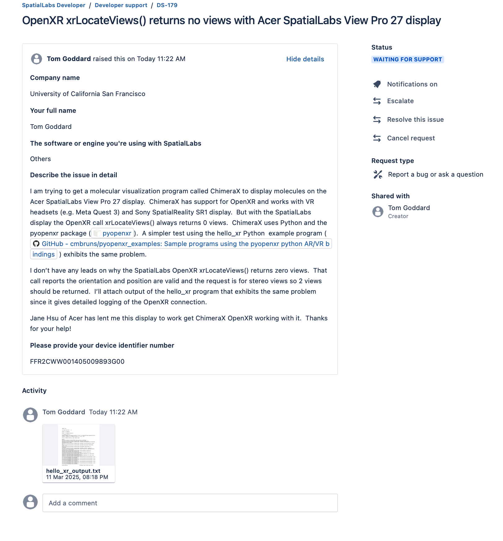 Krish Raman of Biocryst has glasses-free Acer SpatialLabs View Pro 27" 3d display. It is not working with ChimeraX OpenXR (command "xr on"), the device seems to disconnect after a successful OpenXR connection is made. I've put code in to give a clear error message when the device disconnects. I would need to have a display on my desk to debug this further.