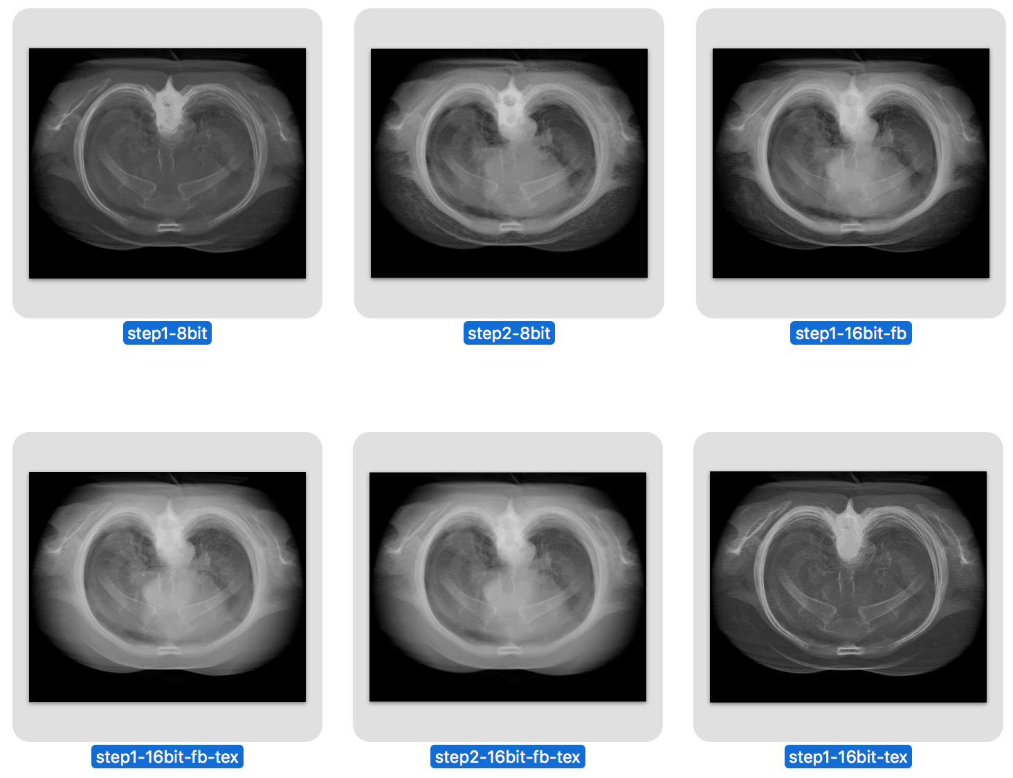 I attached 6 example images of a lung CT scan (folder 4-24533), grid size 512 x 512 x 236, 3d projection rendered with plane spacing minimum along 3 axes, voxel size .576 x .576 x 1.25, so about 500 planes, view along z axis, perspective projection. Step 1 and 2 look quite different with normal 8-bit rendering, but look nearly the same with 16-bit rendering. Both 16-bit framebuffer and 16-bit color/alpha texture contribute have significant effect on the appearance.