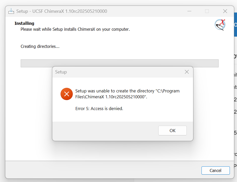 Thanks for reporting this problem. The issue is that you don't have sufficient permissions to create a subfolder of C:\Program Files on the machine you're installing ChimeraX on. Your options are: