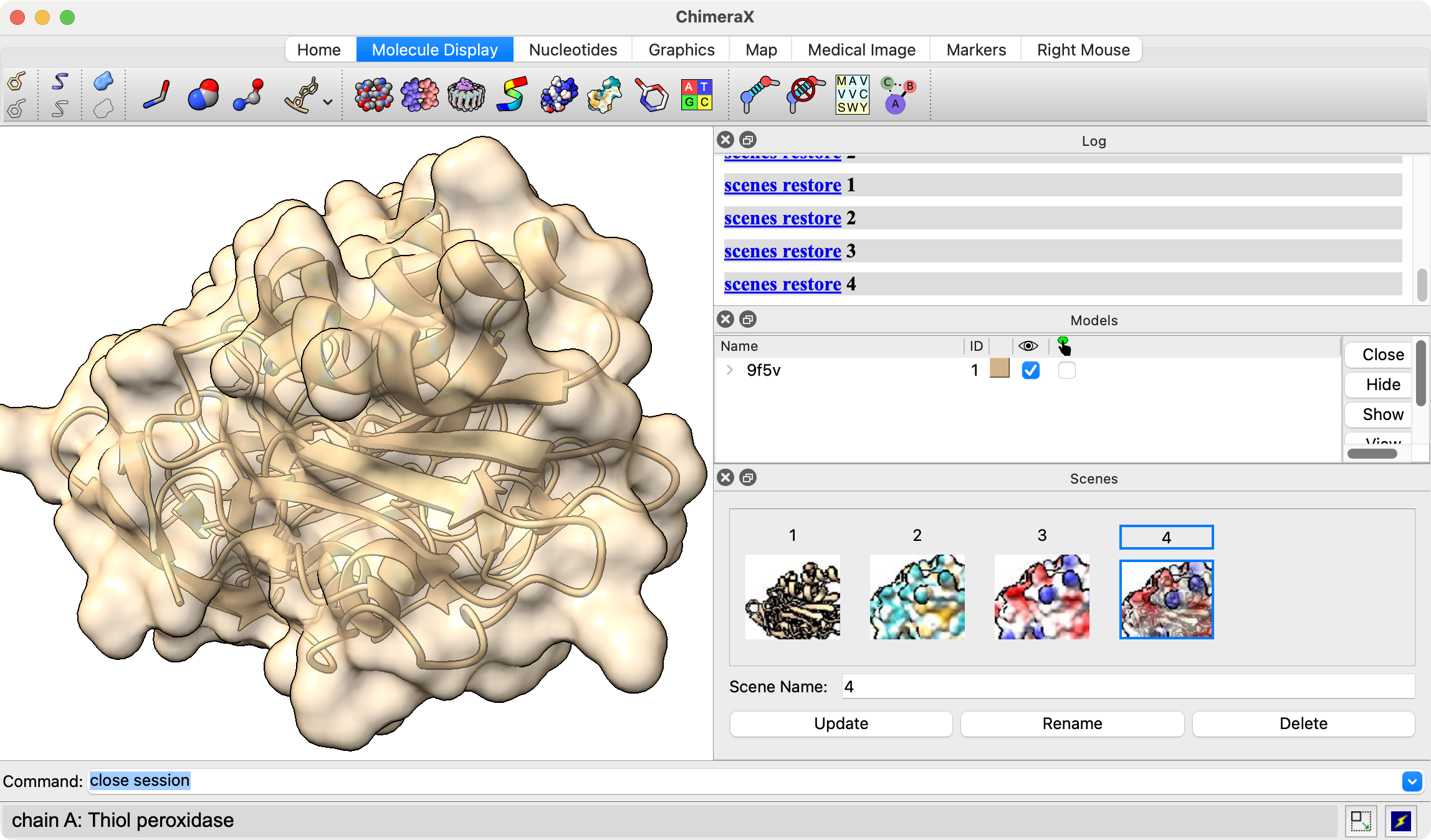 Is this improvement restricted to map surfaces? Per-vertex coloring of molecular surfaces does not seem to be saved/restored via scenes. See screenshot and session attached. Scenes: ribbon alone, mlp surf, esp surf, esp surf 50% transparent, you can kinda see those in the thumbnails. Restoring session and trying to restore scenes only toggles molecular surface display -- coloring and transparency do not change