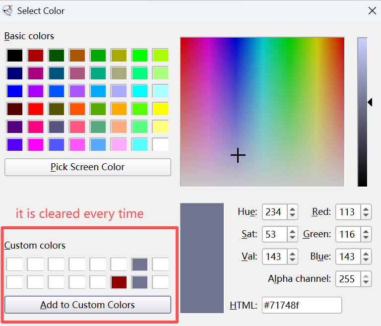 I hope this email finds you well. I am report a bug, or something I mistaked, in v1.11. In previous version, I can added some user-defined colors in the Custom colors section of window "selector color“. However, after I install v1.11, I found this section will lost all the color settings after I restarted the program, which means I have to re-add those customer colors everytime. Is this something new or I make mistake in using this functions? Thanks.
