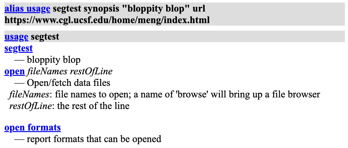 Maybe this is a separate bug, but when I try it in the daily and then show the usage for my alias, it gratuitously appends the usage for existing commands "open" and "open formats". For example, I had an existing alias "segtest" so I tried this command: alias usage segtest synopsis "bloppity blop" url https://www.cgl.ucsf.edu/home/meng/index.html Then when I use "usage segtest" I get this in the Log: