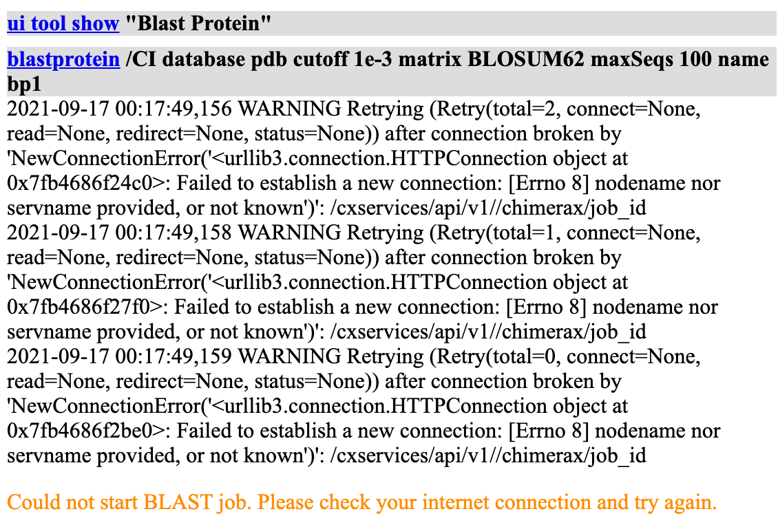 During a meeting yesterday (26 August) our infrastructure was down. When attempting to contact ChimeraX Web Services to run BLAST, ChimeraX froze.