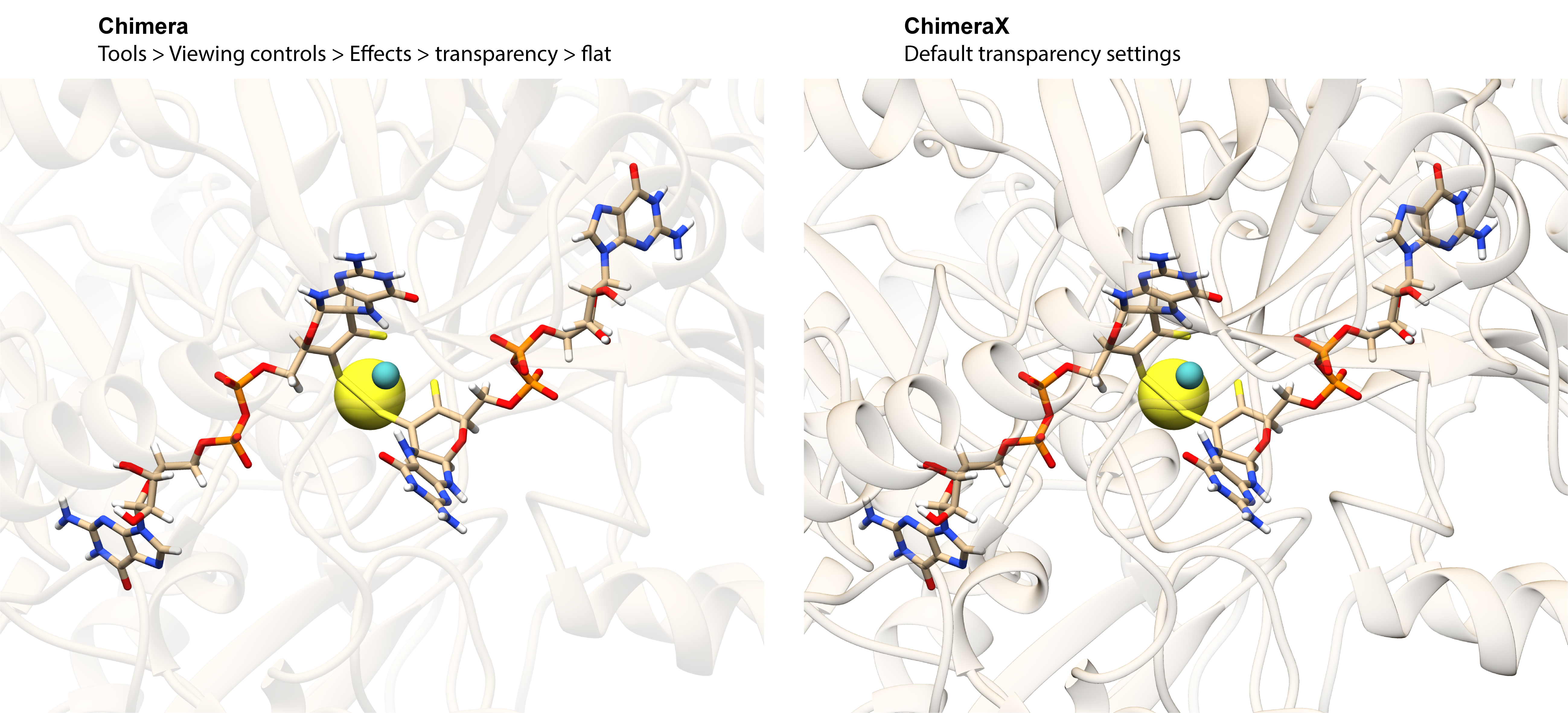 I noticed that in ChimeraX, the “flat” transparency option that was present in Chimera has been either moved or renamed in ChimeraX. This setting made it so the transparency setting wasn’t overwhelming/distracting when focusing on details. In Chimera, it is accessed with Tools > Viewing controls > Effects > transparency > flat. Does anyone know how to achieve this effect in ChimeraX? I find the default ChimeraX transparency option to be disorienting when visualizing details. Here is a rendering comparing the two rendering styles with and without “flat” option. I look forward to your thoughts!
