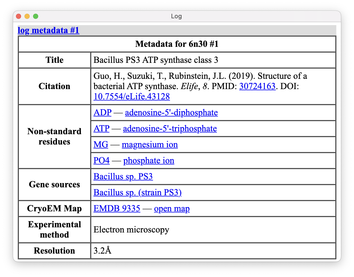 Opening an mmCIF file logs the title and a "more data..." link that shows a table of data, now including links to an EMDB entry and a link to load the map (see attached image).